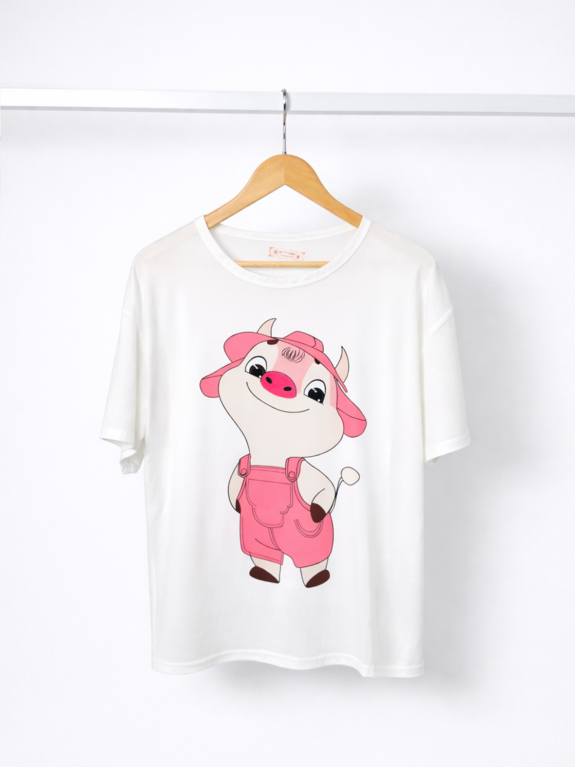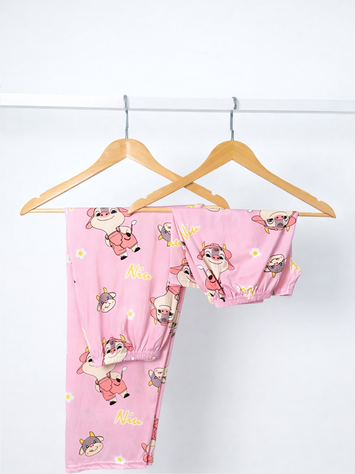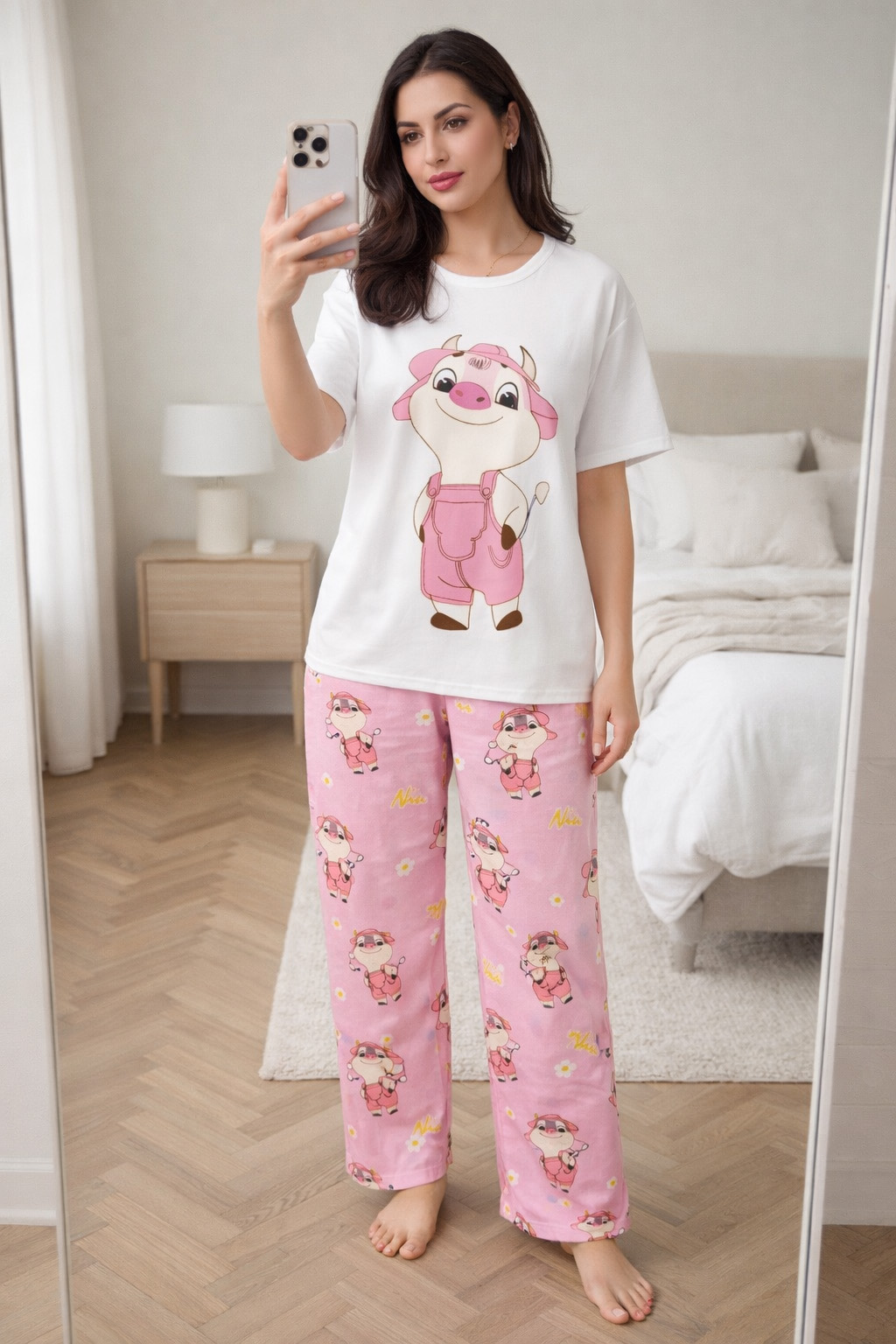 ست تیشرت و شلوار و شورتک وارداتی طرح گاو صورتی